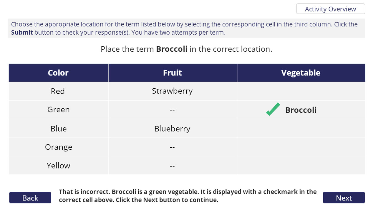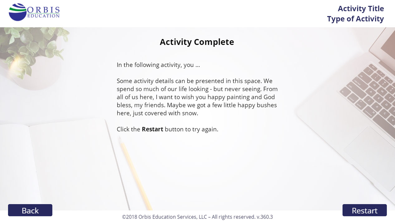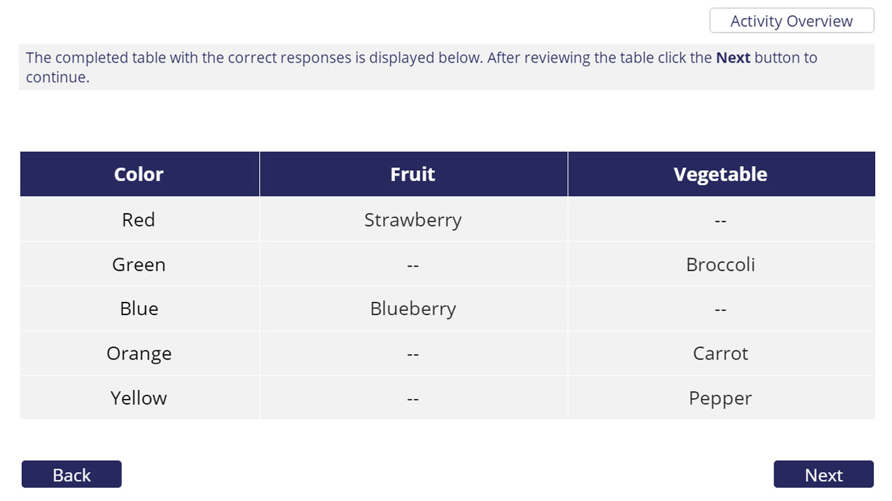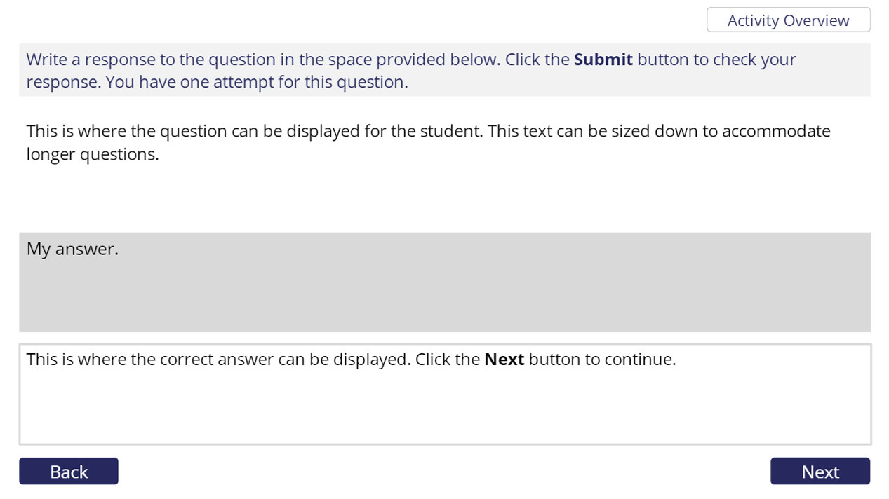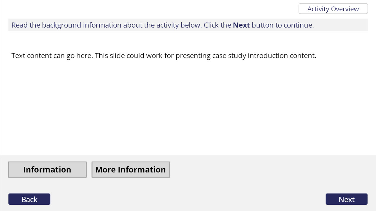 Introduction slide: Includes an area for an activity overview and instructions for users that may need to navigate with a keyboard alone