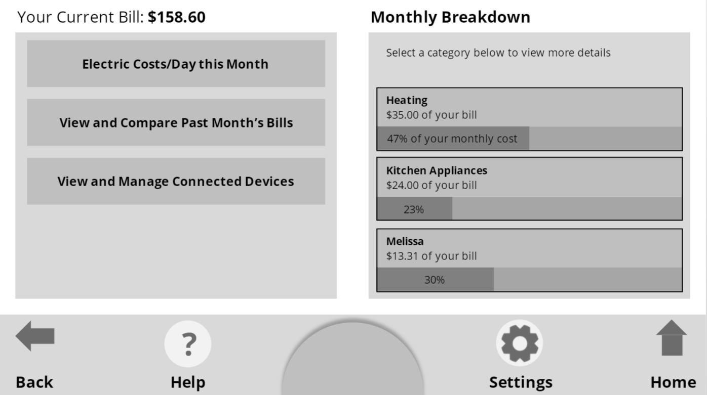 Because this project was heavily focused on idea generation and prototyping techniques time spent defining the user, their needs, and problems was abbreviated. I investigated topics like how smart tech is used in the home, the availability of utility data, and pain points encountered around utility costs. I found that energy and utility consumption was an issue that virtually every home and apartment dweller deals with and many struggle to track, budget, and pay for these bills.