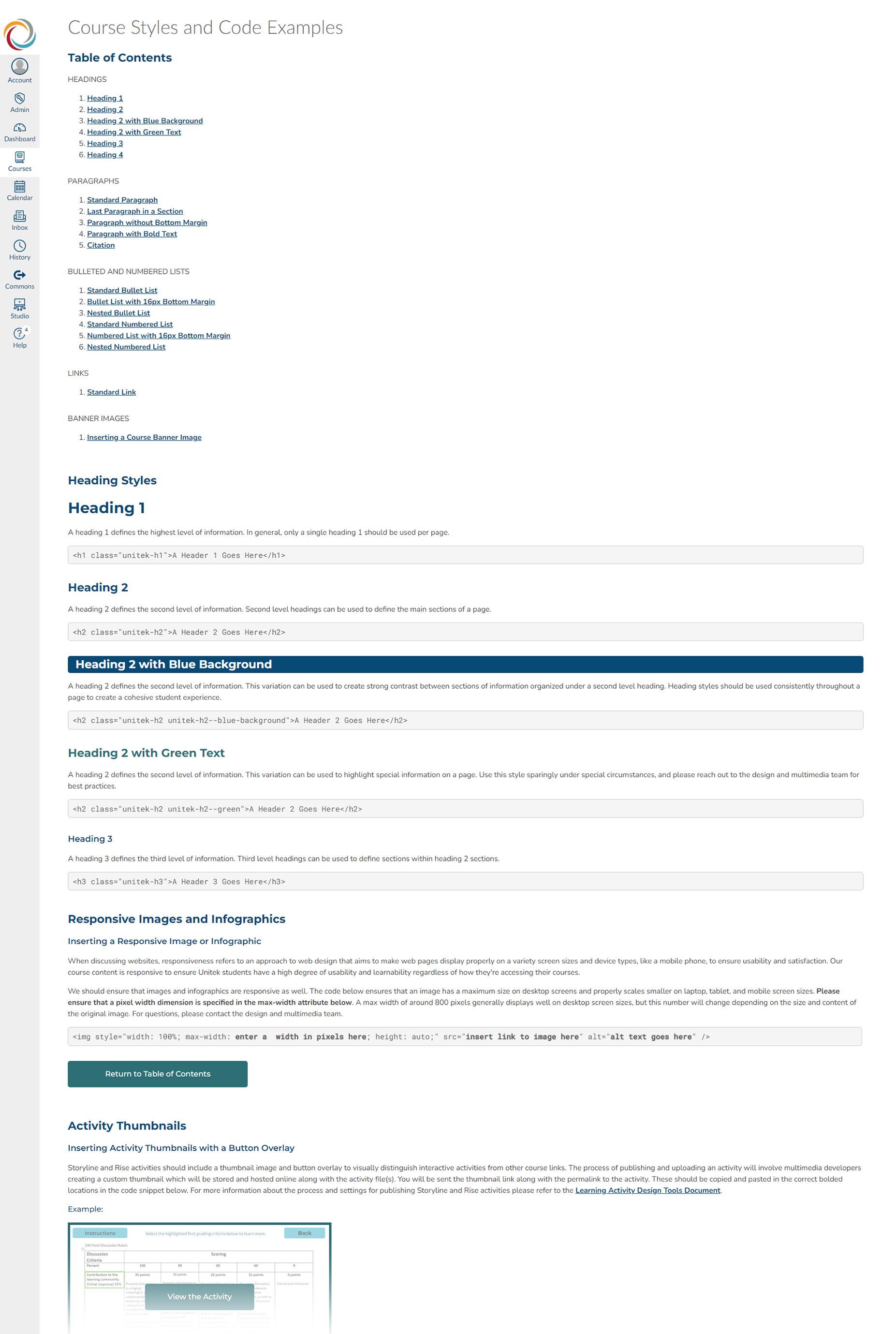 To support scalability, consistency, and documentation, a design system was first established in Adobe XD and an interactive style guide was developed in the learning management system. The style guide provides best practices, visual examples, and code examples to support the instructional design and educational technology teams in implementing the new design.